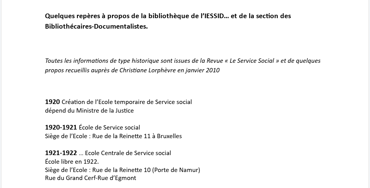 PH-0015 Ce document donne quelques repères historiques et généraux sur la section des bibliothécaires-documentalistes et plus principalement sur la bibliothèque de l'IESSID. On y retrouve notamment des informations sur l'organisation des bibliothèques sociales mais aussi des informations ciblées sur la bibliothèque de l'IESSID avec notamment une liste presque exhaustive des bibliothécaires qui en on été responsables.