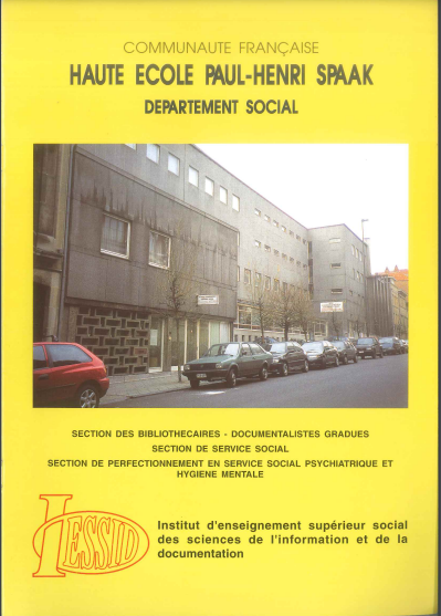PP-0009 Brochure des années 90-2000 réalisée par le département social (IESSID) de la Haute école Paul - Henri Spaak. La brochure propose pour les trois formations dispensées à l'IESSID ; la section assistant social, la section de perfectionnement en service social psychiatrique et hygiène mentale et la section bibliothécaire - documentaliste, un tour d'horizon de ces formations. Allant d'une description des études aux débouchés, en passant par les programmes de cours. Elle se termine par des renseignements utiles pour les futurs étudiants.
