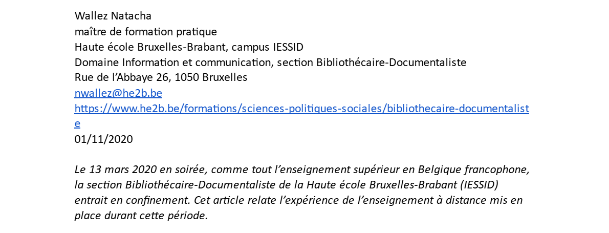 PH-0014 Ce texte rédigé par Natacha Wallez, maitre de formation pratique section bibliothécaire-documentaliste à l'IESSID, relate l’expérience de l’enseignement à distance mis en place par l'école durant toute la période du premier confinement annoncée le 13 mars 2020.