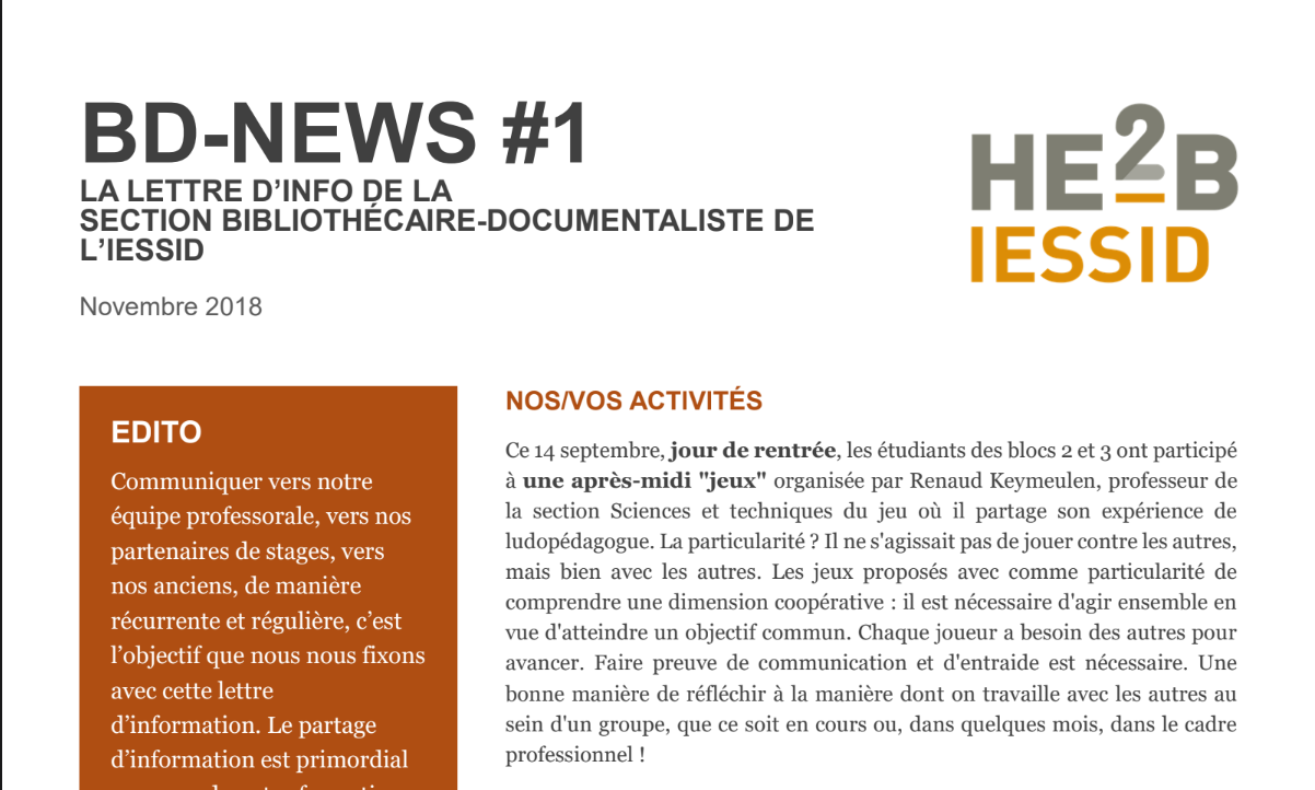 PPE-0001 Première Newsletter en ligne de la section bibliothécaire-documentaliste de l'IESSID. La BD - NEWS est écrite par les étudiants et reprend les nouvelles de l'école et de ses activités, des informations sur les projets, notamment les TFE, des offres d'emploi et des événements à venir.