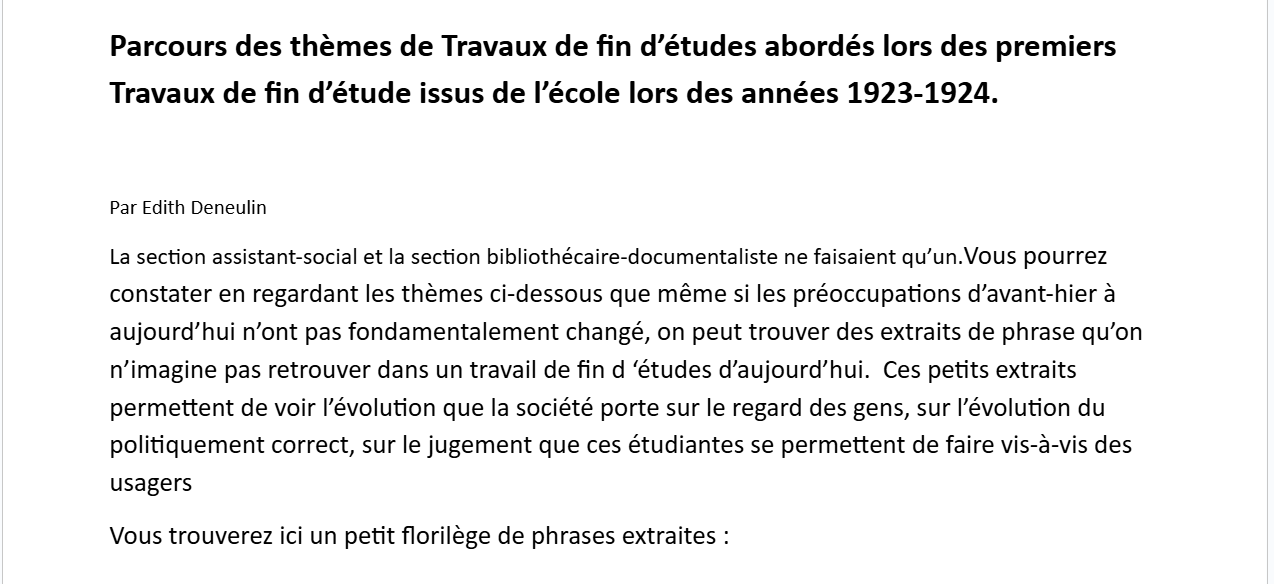 Le document est un florilège de phrases extraites des TFE d'étudiantes de la section assistant-social et la section bibliothécaire-documentaliste qui ne faisaient qu’un à l'époque. On y rencontre des réflexions très différentes de celles qu'un étudiant bibliothécaire-documentaliste ou assistant-social pourrait avoir aujourd'hui. Le décalage sociétal en corrélation avec le décalage temporel y est particulièrement intéressant.