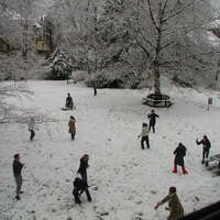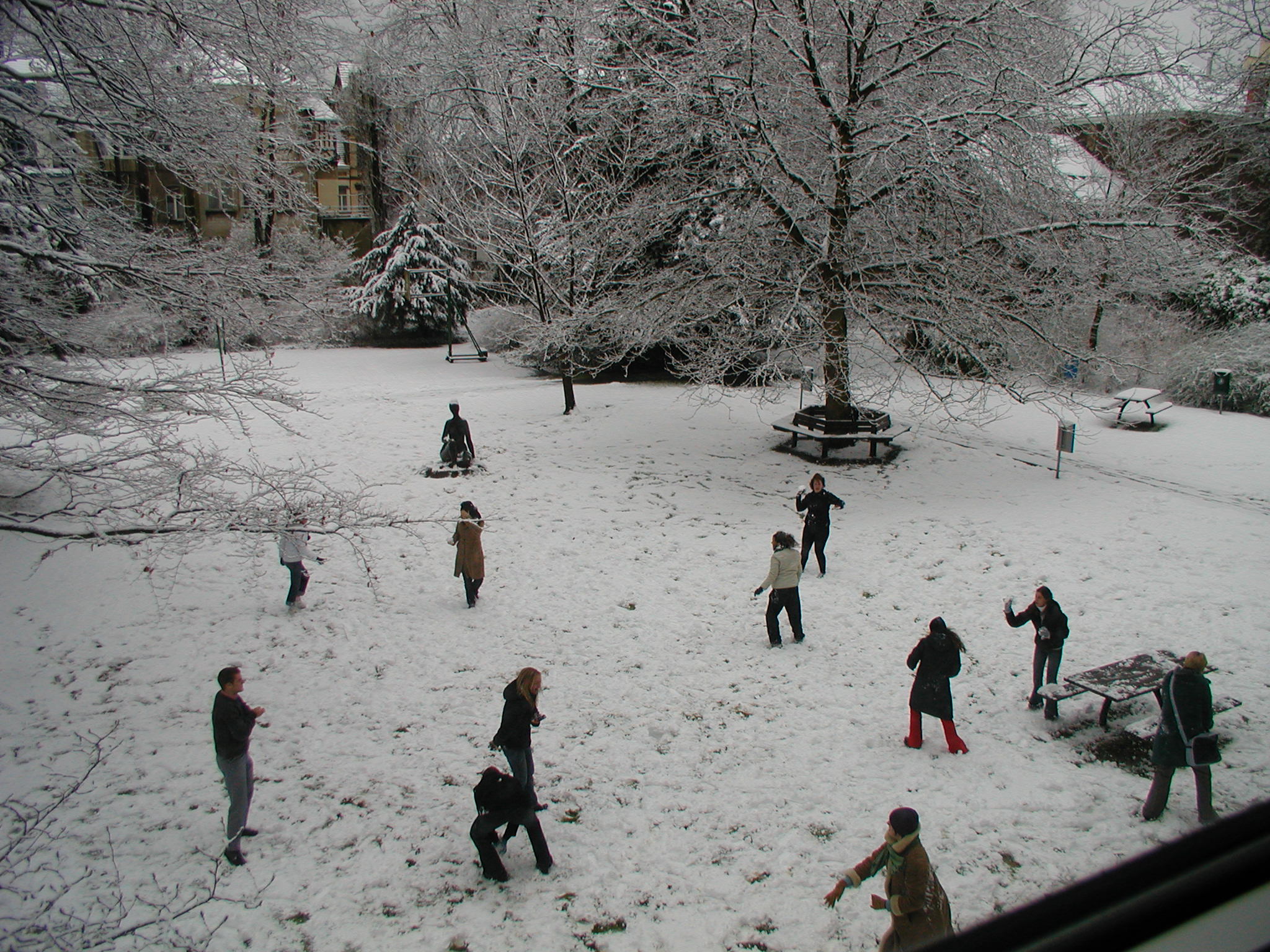 Jardin de l'IESSID enneigé. Un groupe de gens s'adonnant à une bataille de boules de neige. Prise de vue en plongée depuis une fenêtre du bâtiment.