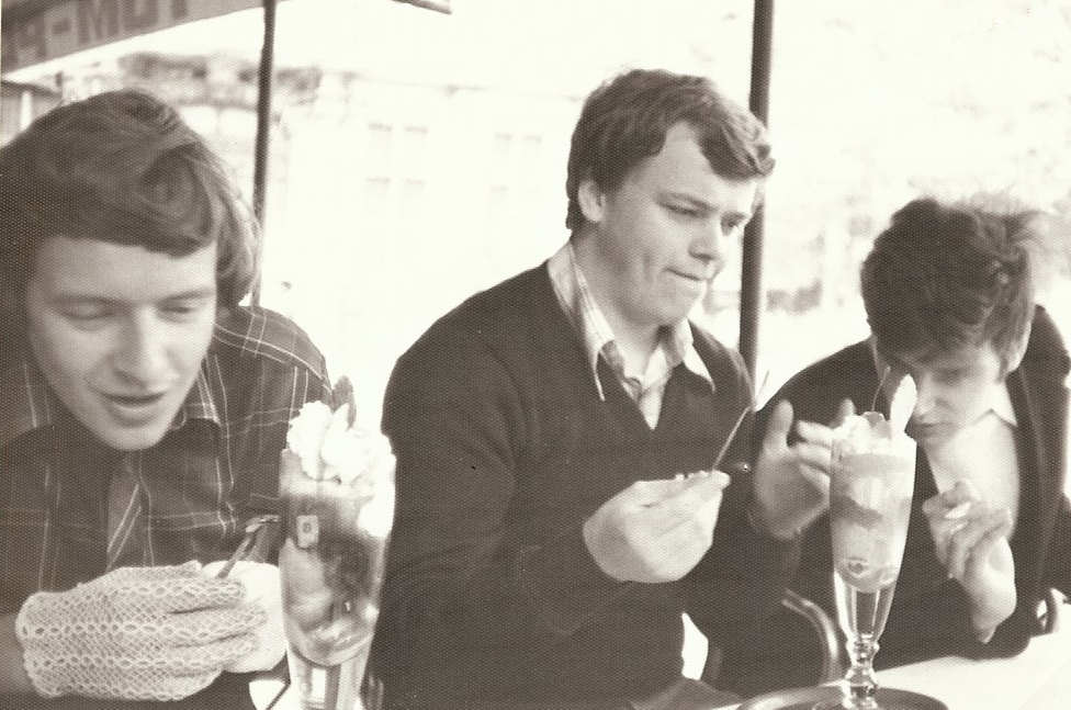 - Trois personnes regardant posé devant eux deux coupes de glace surmontées de chantilly et d'une cerise.
