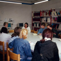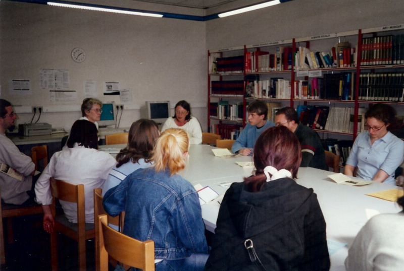 Groupe d'étudiants installé autour d'une grande table écoutant une personne qui parle. Dans le fond deux ordinateurs et le long du mur droit, des étagères remplies de livres.
