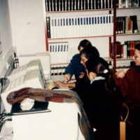 Quatre personnes assises observent l'écran d'un ordinateur. L'une d'entre elles manipule la souris et le clavier. Deux ordinateurs sont posés sur une table face au mur de gauche, le mur du fond est recouvert d'étagères remplies de livres.