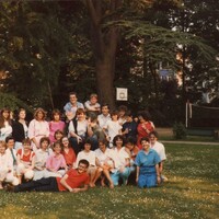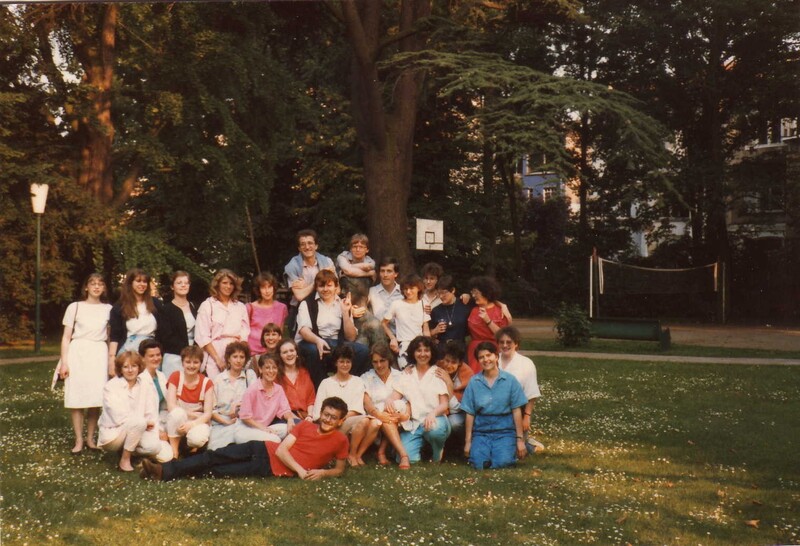 Photo de groupe dans le jardin de l'IESSID rue de l'abbaye. La moitié des étudiants sont à croupi ou à genoux et d'autre debout. Devant le groupe, un étudiant est allongé par terre. Au milieu des étudiants, on voit la tête et l'épaule de la statue du jardin de l'IESSID. L'un des étudiant a les bras posés sur la tête de la statue et un autre a passé le bras autour de son cou.