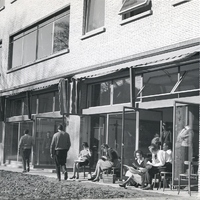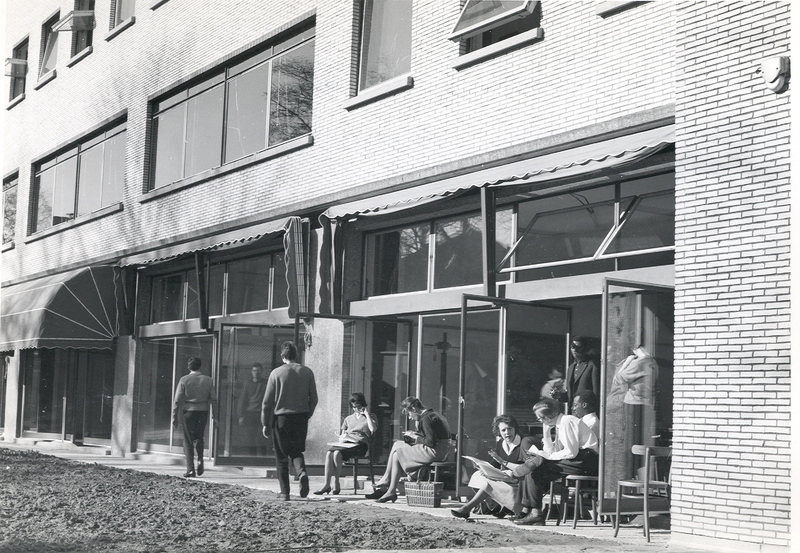 Photographie en noir et blanc de la façade côté jardin de l'ancien bâtiment de l'IESSID, des personnes sont présentes, sans pouvoir distinguer si ce sont des étudiants ou des professeurs.