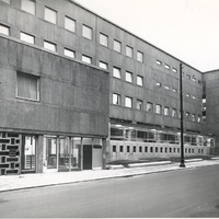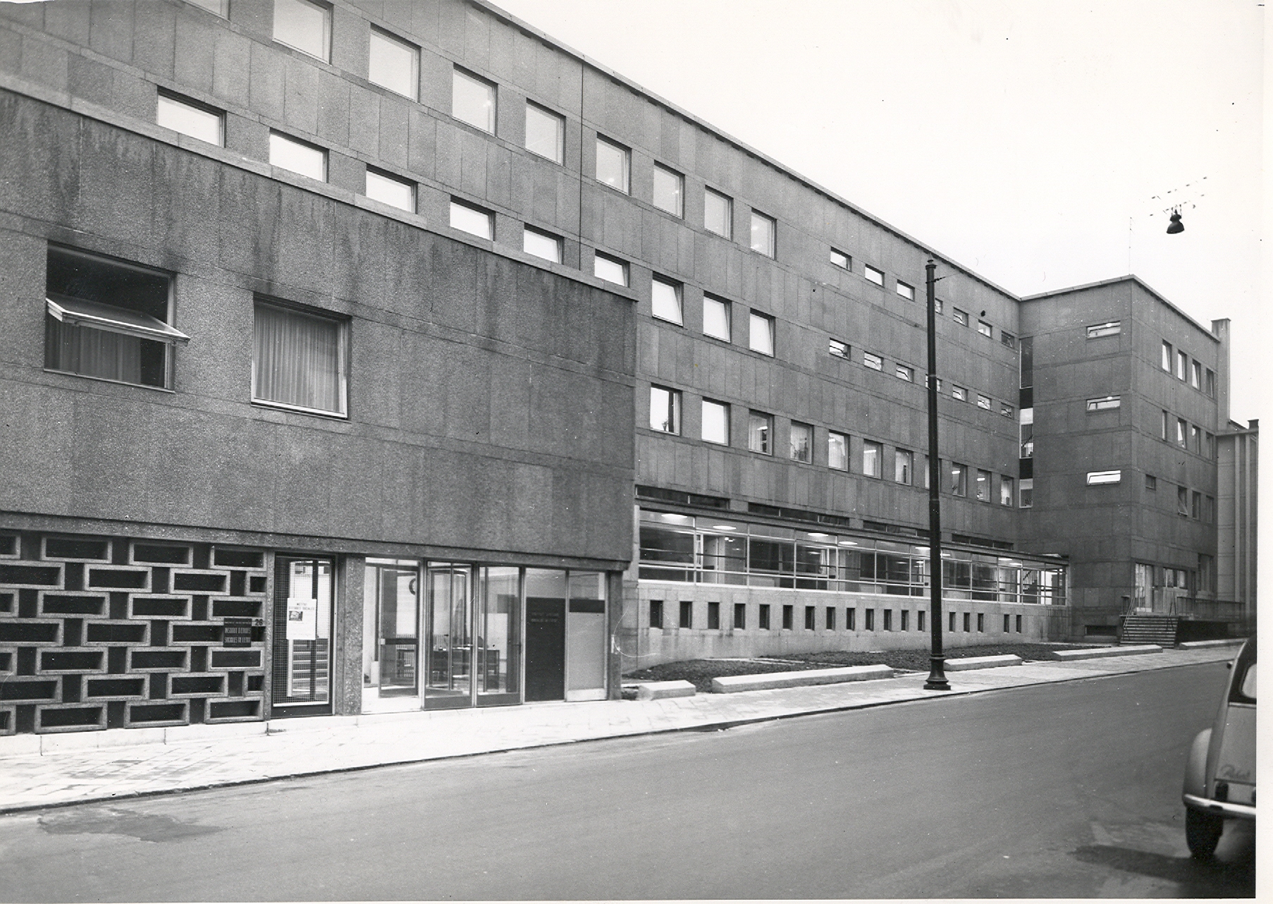 Photographie en noir et blanc de la façade côté rue de l'ancien bâtiment de l'IESSID.