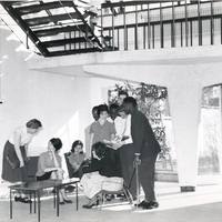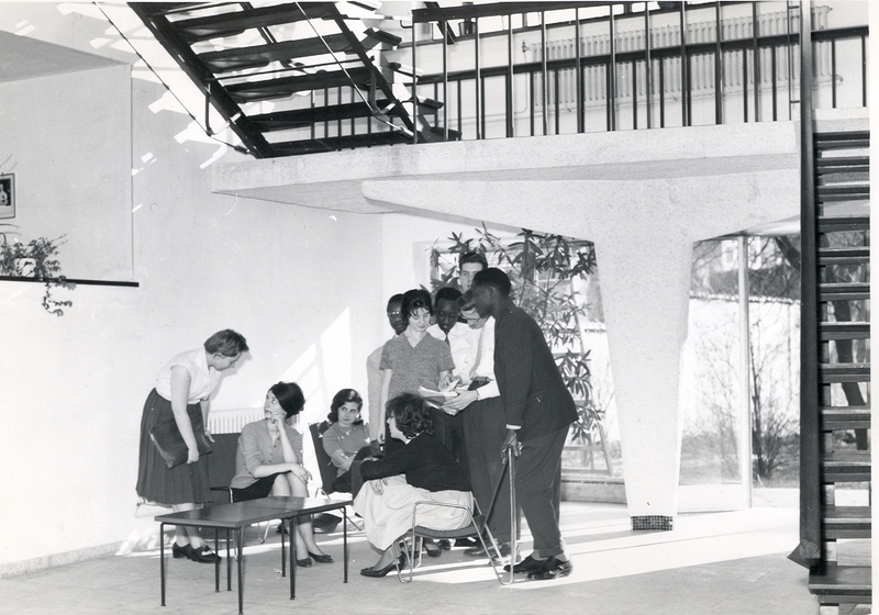 Photographie en noir et blanc de l'ancien hall d'entrée du bâtiment de l'IESSID, des personnes non identifiées s'y trouvent pour un rassemblement.