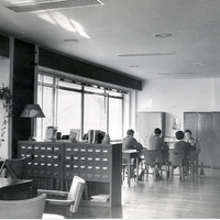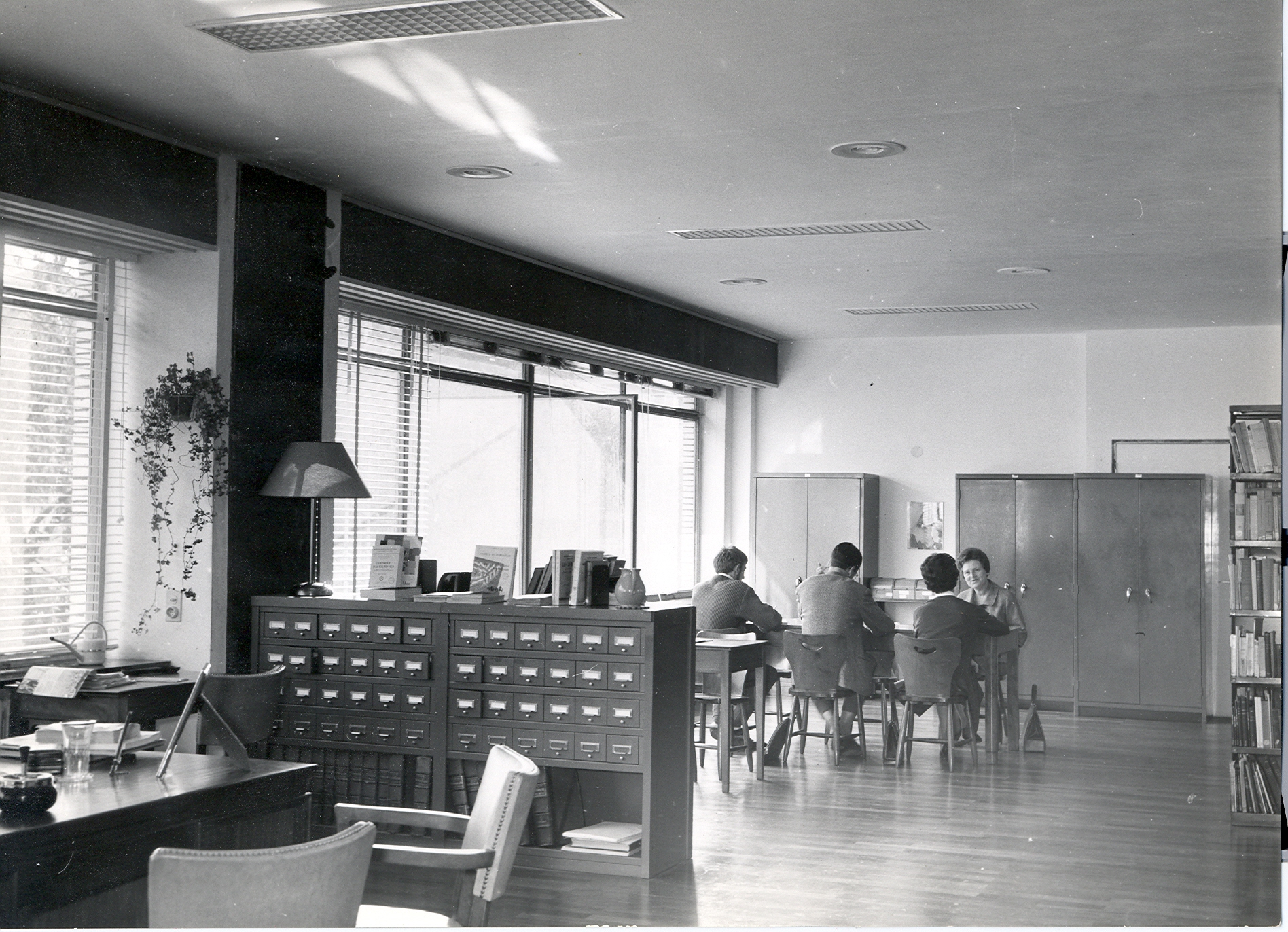 Photographie en noir et blanc de l'emplacement de l'ancienne bibliothèque de l'IESSID. Le bureau de prêt est visible ainsi que l'une des étagères de livres. Plusieurs personnes travaillent et échangent sur la table visible au loin.