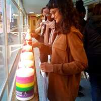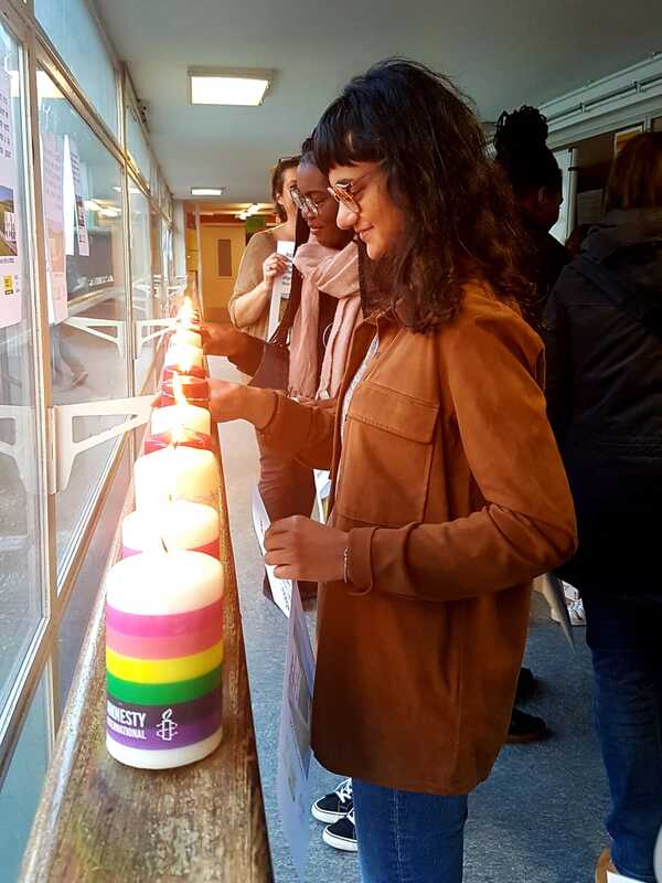 Deux étudiantes de l'IESSID allumant des bougies lors d'une action pour Amnesty International Belgique.